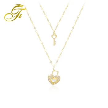 New Fashionable Couple Necklace with Beautiful Exquisite Gold Link Chain Trendy Heart Lock Key Pendant Featuring Zircon Stone
